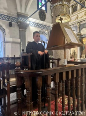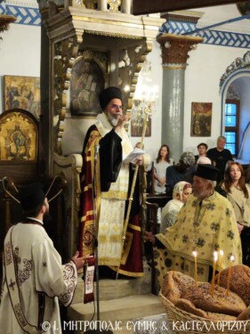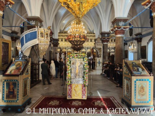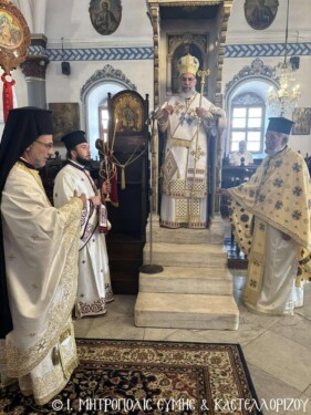 Τῶν λατρευτικῶν Συνάξεων, τόσο στόν Ἑσπερινό τῆς παραμονῆς, ὅσο καί στόν Ὄρθρο καί τήν Θ. Λειτουργία τῆς κυριωνύμου ἡμέρας, προέστη καί λειτούργησε ὁ ἀκούραστος Ποιμενάρχης τοῦ ἱστορικοῦ νησιοῦ , Σεβ. Μητροπολίτης Σύμης, Τήλου, Χάλκης καί Καστελλορίζου κ. Χρυσόστομος, συμπαραστατούμενος ἀπό τόν ἐπίσης ἀκάματο Ἀρχιερατικό Ἐπίτροπο τῆς Νήσου, τόν Πανοσιολ. Ἀρχιμανδρίτη π. Νικόδημο Σκλέπα, τόν πολιό Πρωτοπρεσβύτερο π. Γεώργιο Μαλτέζο, ἐπί πεντηκονταετία Ἐφημέριο τοῦ Καστελλορίζου, πλέον συνταξιοῦχο κληρικό καί τόν Ἱεροδιάκονο τῆς Ἱ. Μητροπόλεως π. Παῦλο Τερεζάκη.