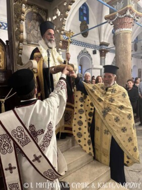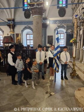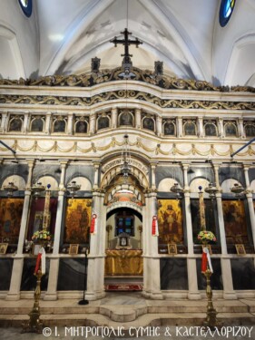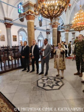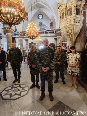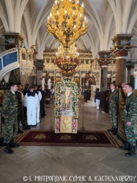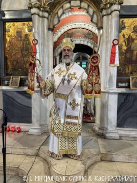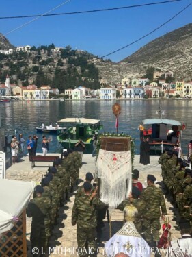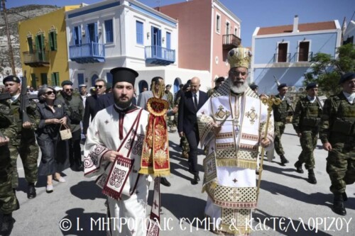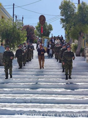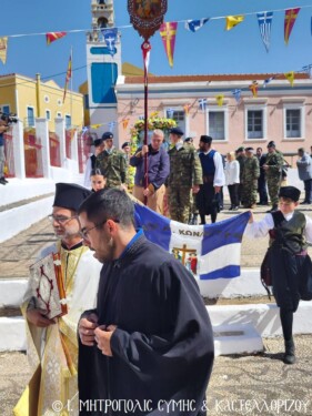 Μέ τήν δέουσα ἐκκλησιαστική τάξη καί τήν λαμπρότητα τῆς Πασχαλίου περιόδου, ὡς καί τήν ὑψηλή παρουσία τοῦ Ὑπουργοῦ Ἐθνικῆς Ἀμύνης κ. Νικολάου Δένδια, ἑορτάστηκε καί ἐφέτος 20ῆ καί 21η Μαΐου 2025 ἐν πληθούσῃ Ἐκκλησίᾳ, ἐδῶ, στίς νοτιοανατολικές ἐσχατιές τῆς Πατρίδος μας, στίς ἐθνικές ἐπάλξεις τοῦ ἀκριτικοῦ μας Καστελλορίζου, ἡ ἱερά μνήμη τῶν πολιούχων του Ἁγίων, Θεοστέπτων Βασιλέων καί Ἰσαποστόλων Κωνσταντίνου καί Ἑλένης. Σύμφωνα μέ τήν ἐκκλησιαστική τάξη καί τίς ὁλοζώντανες τοπικές παραδόσεις, οἱ λατρευτικές ἐκδηλώσεις εἶχαν ὡς ἐπίκεντρο τόν πανηγυρίζοντα ἐπ’ ὀνόματι τῶν Ἁγίων, περίλαμπρο Μητροπολιτικό Ναό τοῦ Νησιοῦ.