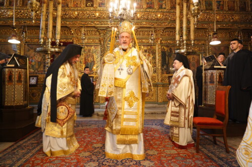 Η Α.Θ. Παναγιότης ο Οικουμενικός Πατριάρχης παρέστη συμπροσευχόμενος στην Τρισαρχιερατική Θεία Λειτουργία, της οποίας προέστη ο Σεβ. Μητροπολίτης Γέρων Χαλκηδόνος κ. Εμμανουήλ, συμπαραστατούμενος από τους Σεβ. Μητροπολίτες Μυριοφύτου και Περιστάσεως κ. Ειρηναίο και Προύσης κ. Ιωακείμ.