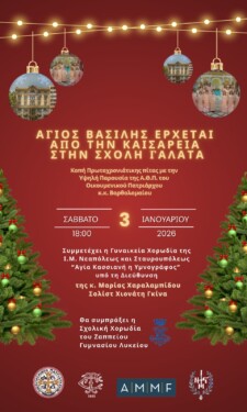 Η Πρωτοχρονιάτικη εκδήλωση της Σχολής Γαλατά θα πραγματοποιηθεί το Σάββατο 3 Ιανουαρίου 2026, στις 18:00, στο κτίριο της ιστορικής Σχολής, με την υψηλή παρουσία του Οικουμενικού Πατριάρχου Βαρθολομαίου.