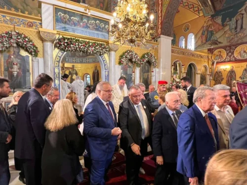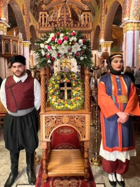 Νωρίτερα, στο πλαίσιο του εορτασμού, πραγματοποιήθηκε στα προπύλαια του Ιερού Ναού η επίσημη υποδοχή τεμαχίου Τιμίου Ξύλου.