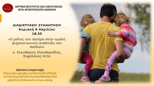 Το Ίδρυμα Νεότητας και Οικογένειας της Ι. Αρχιεπισκοπής Αθηνών διοργανώνει μια ομιλία – συζήτηση με θέμα «Ο ρόλος του πατέρα στην ομαλή ψυχοκοινωνική ανάπτυξη του παιδιού».