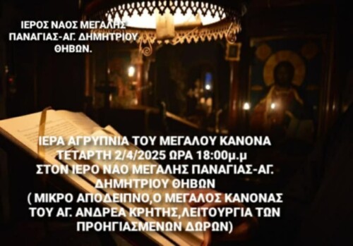 Ιερά Αγρυπνία του Μεγάλου Κανόνα στον Ι.Ναό Μ.Παναγίας- Αγ. Δημητρίου Θηβών