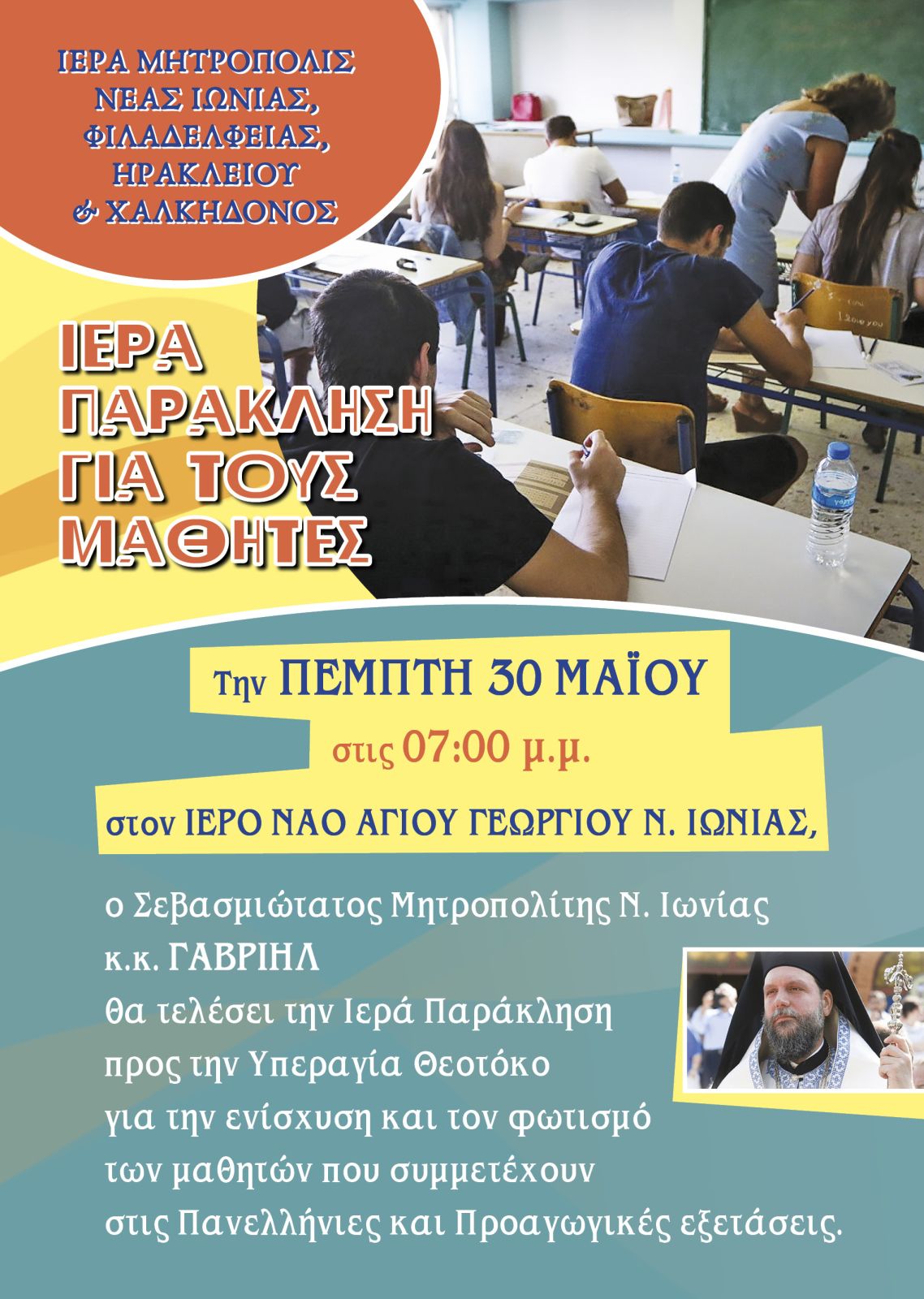 Ο Σεβασμιώτατος Μητροπολίτης μας κ. Γαβριήλ, την Πέμπτη 30 Μαΐου 2024 και ώρα 7:00 μ.μ. θα τελέσει στον Ιερό Ναό Αγίου Γεωργίου Νέας Ιωνίας (πλησίον ΗΣΑΠ Νέας Ιωνίας) Ιερά Παράκληση στην Υπεραγία Θεοτόκο υπέρ ενισχύσεως και φωτισμού των μαθητών Γυμνασίου και Λυκείου που θα μετάσχουν στις Προαγωγικές και στις Πανελλήνιες εξετάσεις.