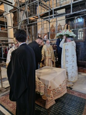 Κατά τη διάρκεια της ακολουθίας του Όρθρου και μετά τη Μεγάλη Δοξολογία, τελέσθηκε, κατά το εκκλησιαστικό τυπικό, η τελετή της προσκυνήσεως του Τιμίου και Ζωοποιού Σταυρού. Οι Ιερείς του ναού λιτάνευσαν τον Τίμιο Σταυρό στο κέντρο του Ιερού Ναού, όπου και τέθηκε προς προσκύνηση από τους πιστούς, ενώ στη συνέχεια ο Σεβασμιώτατος διένειμε τα ευλογημένα άνθη στους παραβρισκόμενους.