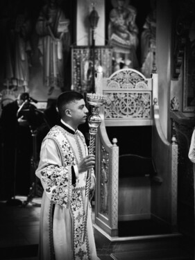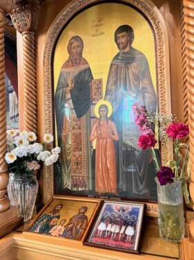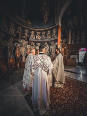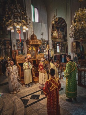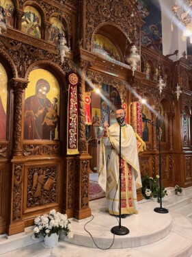 Της Θείας Λειτουργίας προεξήρχε ο Πρωτοπρεσβύτερος π. Νικόλαος Αργυρίου, εφημέριος του Ιερού Ναού, συλλειτουργούντος του Οικονόμου π. Χρήστου Νγκέλα, μέσα σε κλίμα ιεράς κατανύξεως και αναστάσιμης χαράς.
