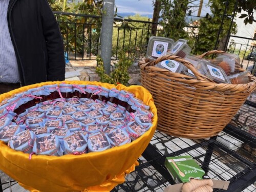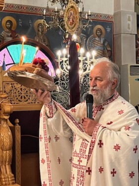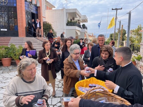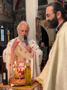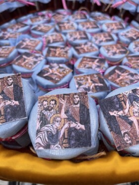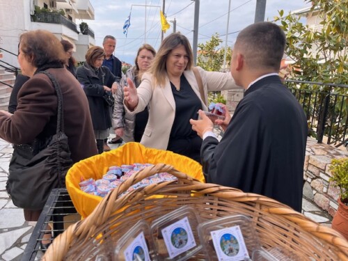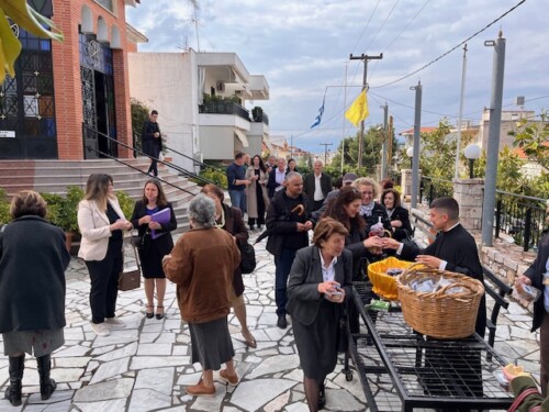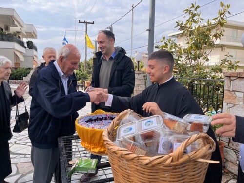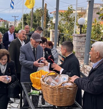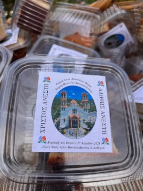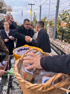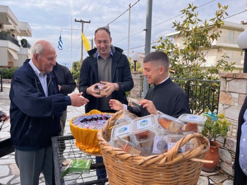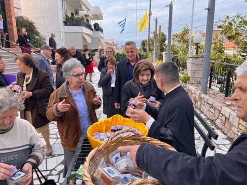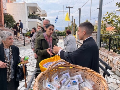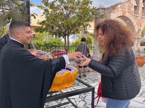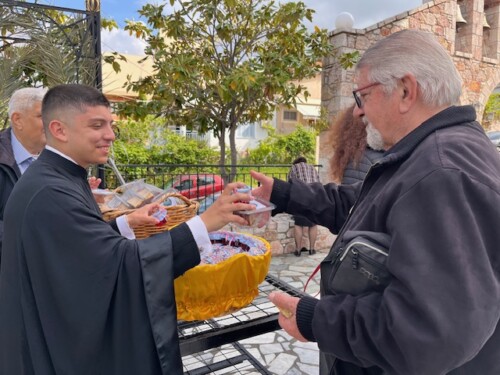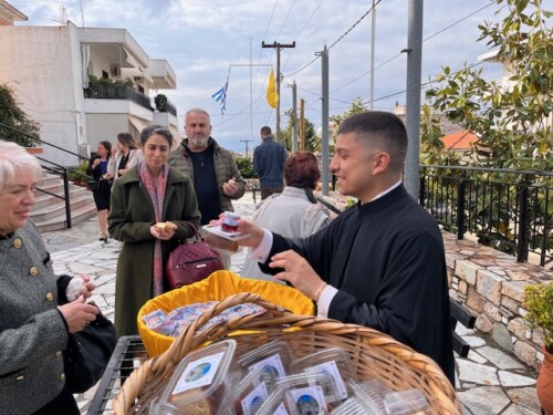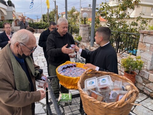 Στο τέλος της Θείας Λειτουργίας, ο εορτάζων, μέσα σε κλίμα αδελφικής αγάπης, διένειμε πασχαλινές ευλογίες και κεράσματα στους παριστάμενους πιστούς, οι οποίοι ανταπέδωσαν με ευχές και δοξολογίες τον Αναστάντα Κύριο.