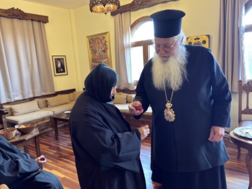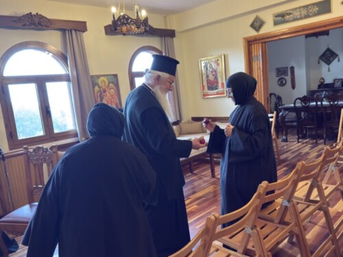 Μετά τη Θεία Λειτουργία ο Σεβασμιώτατος επισκέφθηκε το Ιερό Ησυχαστήριο “Η Μήτηρ του Ηγαπημένου” στο Κλειδί και ευχήθηκε στη Γερόντισσα και τις μοναχές για το Πάσχα.