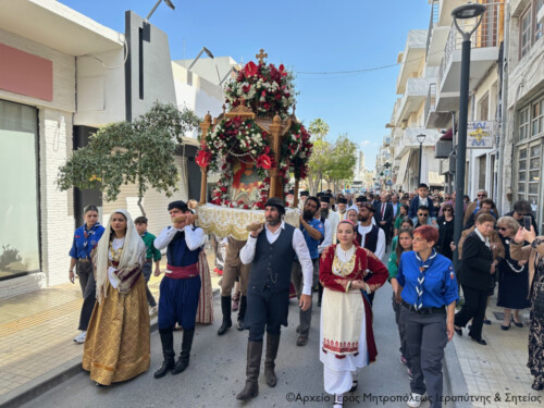 Ανήμερα της πανηγύρεως ο Σεβασμιώτατος Μητροπολίτης Ιεραπύτνης και Σητείας κ. Κύριλλος χοροστάτησε στην Ακολουθία του Όρθρου, ευλόγησε τους άρτους και στη συνέχεια, περιστοιχούμενος από τον Ιερό Κλήρο της πόλεως, ιερούργησε, κήρυξε τον θείο λόγο και προέστη της καθιερωμένης λιτανείας. Στη συγκινητική και μεστή νοημάτων ομιλία του ο Σεβασμιώτατος αναφέρθηκε σε αδρές γραμμές στον βίο και το μαρτύριο, κατά τη διάρκεια των χριστιανικών διωγμών επί Διοκλητιανού, το 303 μ.Χ., του αξιωματικού του ρωμαϊκού στρατού και «στρατιώτη του επουράνιου Βασιλέως», Αγίου Μεγαλομάρτυρος Γεωργίου, σημειώνοντας ότι και οι δύο γονείς του, Γερόντιος και Πολυχρονία, είναι άγιοι της Εκκλησίας μας.
