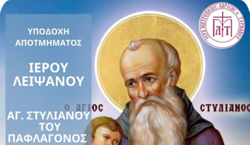 • 5.00 μ.μ.: Υποδοχή αποτμήματος Ιερού Λειψάνου του Αγίου από την Ιερά Μονή Κορώνας και στη συνέχεια θα τελεστεί Μέγας πανηγυρικός Αρχιερατικός Εσπερινός, χοροστατούντος του Σεβ. Μητροπολίτου Λαρίσης και Τυρνάβου κ. Ιερωνύμου.