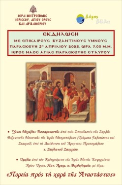 Ἡ Ἱερά Μητρόπολις Ἱερισσοῦ, Ἁγίου Ὄρους καί Ἀρδαμερίου, σέ συνεργασία μέ τόν Δῆμο Βόλβης, διοργανώνει μεγάλη ἐκδήλωση ἐν ὄψει τῆς Μεγάλης Ἑβδομάδος τῶν Παθῶν τοῦ Κυρίου, τήν Παρασκευή 3η Ἀπριλίου 2026, στόν Ἱερό Ναό Ἁγίας Παρασκευῆς Σταυροῦ, καί ὥρα 7.00 μ.μ., ὑπό τόν γενικό τίτλο: «Πορεία πρός τη χαρά τῆς Ἀναστάσεως».
