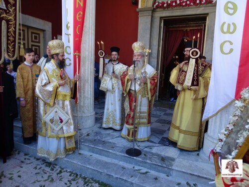 Ακολούθησε λιτάνευση, γύρωθεν του Ναού, των Ιερών Λαβάρων και της Ιερής Εικόνας της Αναστάσεως. Η θρησκευτική τελετή επισφραγίστηκε με την διανομή των πασχαλινών αυγών από τον Σεβασμιώτατο, στην είσοδο του Ναού, και με την ανταλλαγή εγκάρδιων ευχών με τους τοπικούς άρχοντες και τους παρευρισκόμενους πιστούς.