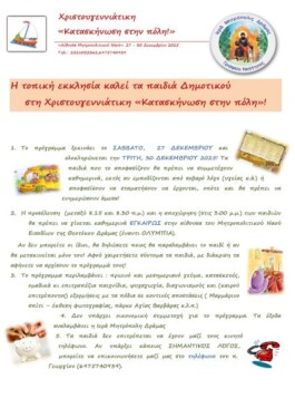 Από το Σάββατο 27 έως την Τρίτη 30 Δεκεμβρίου 2025, η τοπική μας Εκκλησία προσκαλεί τα παιδιά της σε ένα χριστουγεννιάτικο κατασκηνωτικό τετραήμερο.