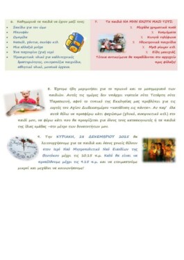 Γνωριμία με το νόημα των εορτών του Αγίου Δωδεκαημέρου, παιχνίδι πολύ, δημιουργική απασχόληση ανάλογα με την ηλικία, διαγωνισμοί, πρωταθλήματα, καινούρια επιτραπέζια παιχνίδια, συμμετοχή στη Θεία Λατρεία και συζητήσεις ωφέλιμες, κοινά γεύματα, εξορμήσεις  και πολλές ακόμη, μικρές και μεγάλες εκπλήξεις περιμένουν τα παιδιά που θα δηλώσουν συμμετοχή: αγόρια και κορίτσια, από την Α΄ μέχρι τη Στ΄ τάξη του Δημοτικού Σχολείου.