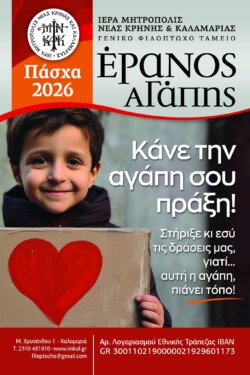 Το Πάσχα είναι η γιορτή της αγάπης, της προσφοράς και της ελπίδας. Σε μια περίοδο που το μήνυμα της αλληλεγγύης γίνεται πιο επίκαιρο από ποτέ, σας προσκαλούμε να ενώσουμε τις δυνάμεις μας στον Έρανο Αγάπης Πάσχα 2026 της Ιεράς Μητρόπολης Νέας Κρήνης και Καλαμαριάς .