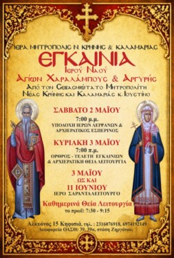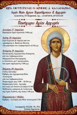 Ο Ιερός Ναός Αγίων Χαραλάμπους και Αργυρής της Ιεράς Μητροπόλεως Νέας Κρήνης και Καλαμαριάς , προσκαλεί τους πιστούς να συμμετάσχουν στις λατρευτικές εκδηλώσεις για την Πανήγυρη της Αγίας Αργυρής καθώς και στα Εγκαίνια του Ιερού Ναού.
