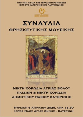 Η συναυλία, η οποία τελεί υπό την αιγίδα της Ιεράς Μητροπόλεως Κίτρους, Κατερίνης και Πλαταμώνος και διοργανώνεται από το Δημοτικό Ωδείο Κατερίνης, θα πραγματοποιηθεί στον Ιερό Ναό Αγίας Άννης.