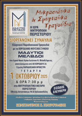 Η Ιερά Μητρόπολη Περιστερίου διοργανώνει συναυλία Ελληνικού Παραδοσιακού Τραγουδιού με το Χορωδιακό Μουσικό Σύνολο «Μαδυτιοί Μελωδοί» του Ιερού Ναού Αγίου Ιωάννου Ν. Φιλαδελφείας. Το σύνολο αποτελείται από 60 χορωδούς και 12μελή παραδοσιακή ορχήστρα.