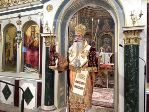 Κατά τη διάρκεια του κηρύγματός του ο Σεβασμιώτατος, μεταξύ άλλων, αναφέρθηκε στη θαυματουργή εικόνα της Παναγίας Βηματαρίσσης, αντίγραφο της οποίας βρίσκεται στον Ναό, στο ιστορικό γεγονός του 1929, όταν η Υπεραγία Θεοτόκος εμφανίστηκε σωματικώς στον Ναό της Ευαγγελιστρίας Πειραιώς, αλλά και στο διαχρονικό μήνυμα της Αναστάσεως του Χριστού ως νίκη της ζωής επί του θανάτου και πηγή ελπίδας, ειρήνης και χαράς για τον άνθρωπο.
