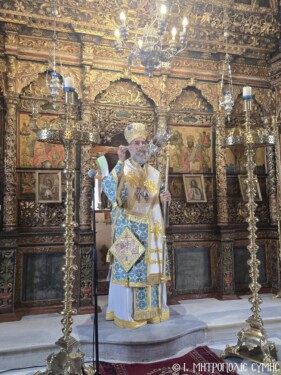 Ὁ Σεβασμιώτατος ὁμίλησε πρός τούς ἐκκλησιαζομένους πιστούς, λαμβάνοντας ἀφορμή ἀπό τήν  εὐαγγελική περικοπή τῆς ἀναστάσεως ἀπό τόν Χριστό, τοῦ υἱοῦ τῆς χήρας τῆς Ναΐν, τήν ὁποία ὁ Κύριος συνάντησε νά συνοδεύει στό μνῆμα τόν μοναχογιό της. Ὅλος ὁ πόνος, ὅλη ἡ ἀπελπισία τῆς ζωῆς εἶναι συγκεντρωμένα σ’ αὐτή τήν τραγική στιγμή. Κι ὅμως, ἐκεῖ πού τελειώνουν οἱ ἀνθρώπινες δυνάμεις, ἀρχίζει ἡ δύναμη τοῦ Θεοῦ. Ὁ Φιλάνθρωπος Κύριος συγκινεῖται καί μή περιμένοντας νά Τοῦ ζητηθεῖ, ἀγγίζει τό φέρετρο καί δίνει προσταγή: «Νεανίσκε, σοί λέγω, ἐγέρθητι». Καί ὁ νεκρός ἀνασταίνεται!
