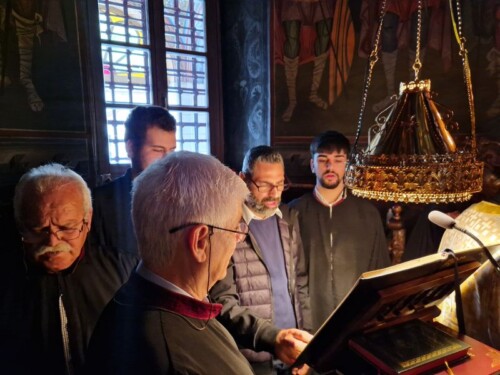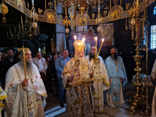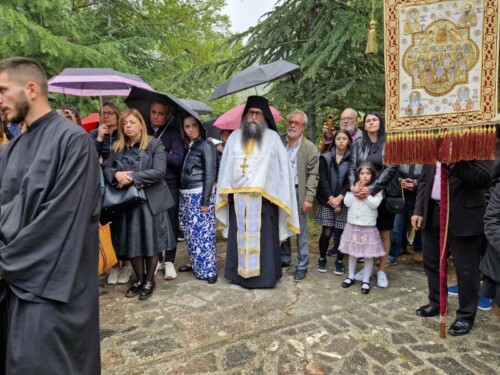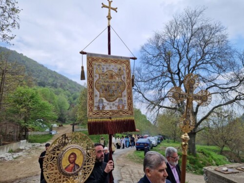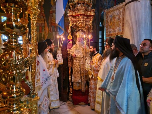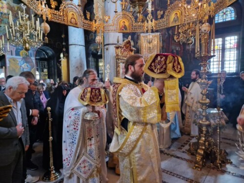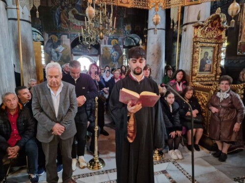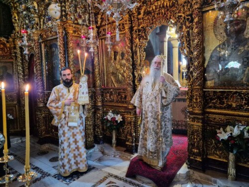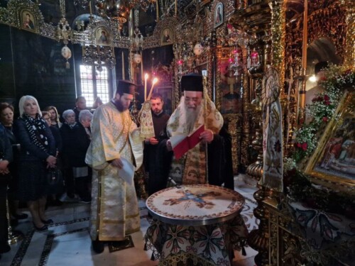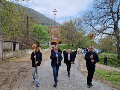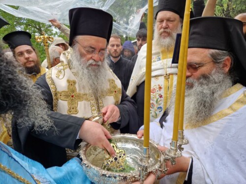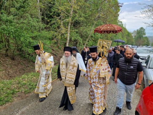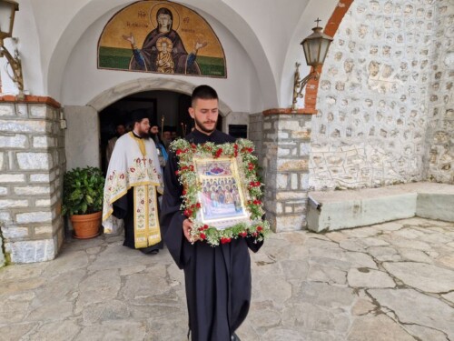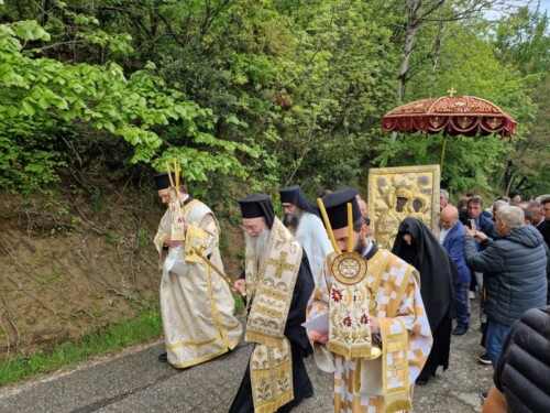 Ακολούθως έγινε η παραδοσιακή πασχάλια λιτάνευση της εφεστίου αχειροποιήτου Ιεράς Εικόνος της Παναγίας της Εικοσιφοινίσσης, στο χώρο όπου κατά την παράδοση τελέσθηκε το θαύμα της αχειροποιήτου αποτυπώσεως της μορφής της Παναγίας και της εμφανίσεως της στον όσιο Γερμανό και εψάλη ο Αγιασμός.