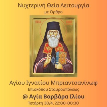 Νυχτερινή Θεία Λειτουργία επί τη μνήμη του Αγίου Ιγνατίου Μπριαντσανίνωφ θα τελεστεί στον Ι.Ν. Αγίας Βαρβάρας Ιλίου, την Τετάρτη 30/4/2025, από 22:00 έως 00:30 περίπου.
