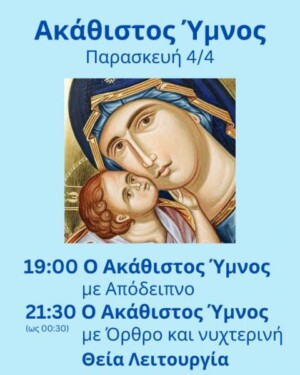 Την Παρασκευή 4 Απριλίου 2025, ο Ακάθιστος Ύμνος θα ψαλεί δύο φορές στον Ι.Ν. Αγίας Βαρβάρας Ιλίου: