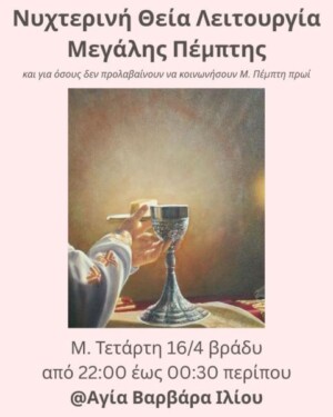 Νυχτερινή Θεία Λειτουργία της Μεγάλης Πέμπτης, τη Μεγάλη Τετάρτη 16/4 το βράδυ, από 22:00-00:30 περίπου, θα τελεστεί στον Ιερό Ναό Αγίας Βαρβάρας Ιλίου.