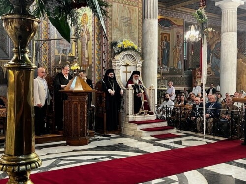 Ο Μακαριώτατος ευχήθηκε χρόνια πολλά και ευλογημένα σε όλους και μίλησε για τους Αγίους Κωνσταντίνο και Ελένη. Ανέφερε, ακόμη, ότι ο Επίσκοπος μιας περιοχής έχει τις ενορίες του -και φροντίζει για αυτές- και κάθε μια ενορία είναι σαν μια οικογένεια, η οποία έχει άλλοτε πολλά και άλλοτε λίγα μέλη. Κάθε οικογένεια έχει σκοπούς αλλά και πολλές δυσκολίες.