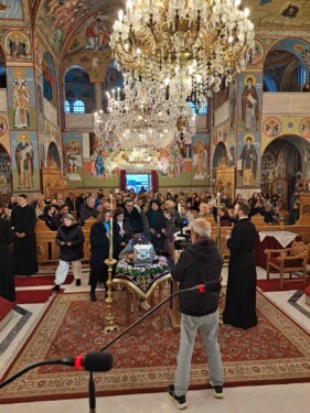 Το ιερότατο σέβασμα της Εκκλησίας μας υποδέχθηκε επισήμως στα προπύλαια του Ναού ο Σεβ. Μητροπολίτης Δημητριάδος κ. Ιγνάτιος, επικεφαλής του Ιερού Κλήρου και μεγάλου πλήθους φιλάγιων πιστών. Ακολούθησε η Ακολουθία του Μεγάλου Αποδείπνου, μετά του Παρακλητικού Κανόνος του Αγίου Δαυίδ, χοροστατούντος του Σεβασμιωτάτου. Στο τέλος της Ακολουθίας ο Προϊστάμενος του Ναού Αρχιμ. Επιφάνιος Οικονόμου, εξέφρασε την χαρά και την συγκίνηση της ενορίας του Αγίου Νικολάου για την προσγενομένη τιμή, λίγο πριν την είσοδό μας στα «Άγια των Αγίων» της εκκλησιαστικής εμπειρίας, την Αγία και Μεγάλη Εβδομάδα και χαρακτήρισε τα ιερά Λείψανα των Αγίων τον μεγάλο θησαυρό της Εκκλησίας, που συνιστά την ζωντανή παρουσία και ενέργεια του Αγίου Πνεύματος στην ζωή μας.