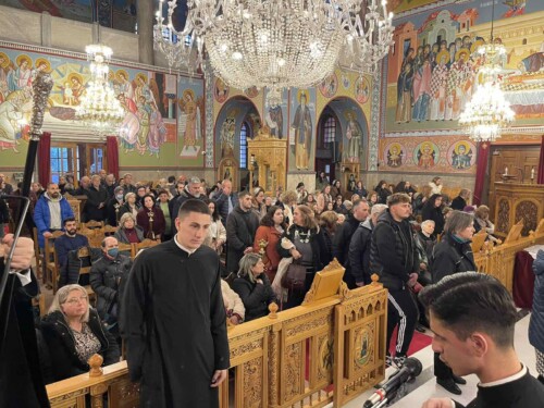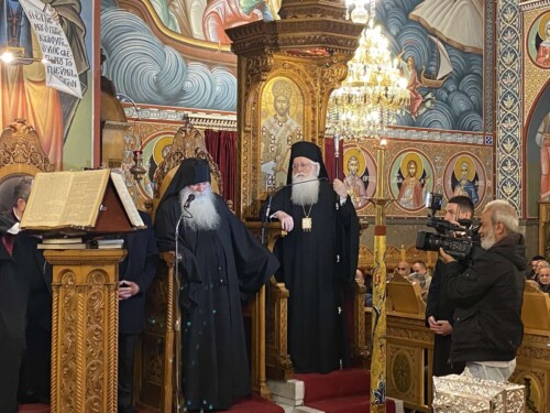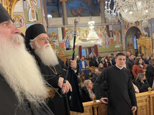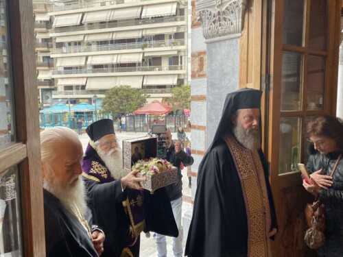 Το ιερότατο σέβασμα της Εκκλησίας μας υποδέχθηκε επισήμως στα προπύλαια του Ναού ο Σεβ. Μητροπολίτης Δημητριάδος κ. Ιγνάτιος, επικεφαλής του Ιερού Κλήρου και μεγάλου πλήθους φιλάγιων πιστών. Ακολούθησε η Ακολουθία του Μεγάλου Αποδείπνου, μετά του Παρακλητικού Κανόνος του Αγίου Δαυίδ, χοροστατούντος του Σεβασμιωτάτου. Στο τέλος της Ακολουθίας ο Προϊστάμενος του Ναού Αρχιμ. Επιφάνιος Οικονόμου, εξέφρασε την χαρά και την συγκίνηση της ενορίας του Αγίου Νικολάου για την προσγενομένη τιμή, λίγο πριν την είσοδό μας στα «Άγια των Αγίων» της εκκλησιαστικής εμπειρίας, την Αγία και Μεγάλη Εβδομάδα και χαρακτήρισε τα ιερά Λείψανα των Αγίων τον μεγάλο θησαυρό της Εκκλησίας, που συνιστά την ζωντανή παρουσία και ενέργεια του Αγίου Πνεύματος στην ζωή μας.
