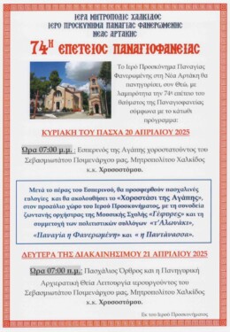 Και εφέτος, ο καθιερωμένος Εσπερινός της Αγάπης, χοροστατούντος του Σεβασμιωτάτου Μητροπολίτου Χαλκίδος κ. Χρυσοστόμου, πρόκειται να τελεσθεί την Κυριακή του Πάσχα, 20 Απριλίου 2025, στις 6:30μ.μ., στον Προσκυνηματικό Ιερό Ναό της Παναγίας Φανερωμένης Ν. Αρτάκης, επ’ ευκαιρία της 74ης επετείου της Παναγιοφανείας εκεί.