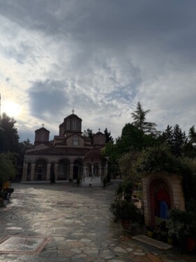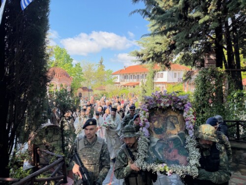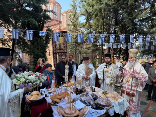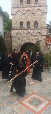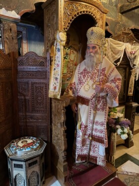 Ακολούθως αναφέρθηκε στον εορτάζοντα Άγιο Γεώργιο, σημειώνοντας “… Η εορτή του Αγίου Γεωργίου γίνεται κριτήριο δικό μας. Η αλήθεια του Θεού και οι Άγιοι μας, ο ΄Αγιος Γεώργιος που βίωσε αυτή την αλήθεια, κριτήριο  και της δικής μας ζωής. Που έχουμε δώσει την καρδιά μας; Μετράμε, άραγε την πίστη μας και την ζωή μας με το μέτρο της Εκκλησίας; Χρειάζεται γενναιότητα και πνευματική ανδρεία. ‘ει έχεις καρδία δύνασαι σωθήναι’. Σώζονται οι γενναίοι, όχι οι δειλοί”, κατέληξε ο Επίσκοπος μας, προσφέροντας στο ιερό Ησυχαστήριο ζεύγος δισκοποτήρων. Παρά την έντονη βροχόπτωση και τις δύο ημέρες συγκινητική η συμμετοχή πλήθους πιστών οι οποίοι είχαν κατακλύσει την Μονή και τους προαύλιους χώρους της το εόρτιο διήμερο και, με ευλάβεια και σεβασμό, μετείχαν της ιεράς πανηγύρεως.