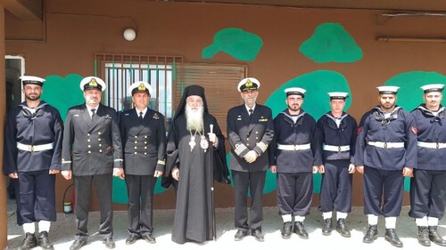 Ὁμίλησε καί Συνομίλησε μέ τούς ἐκεί ὑπηρετούντες Ἀξιωματικούς, Ὑπαξιωματικούς καί Ναύτες καί τούς εὐχαρίστησε γιά τήν συμμετοχή τούς στήν Ἱερά Πανήγυρη τῆς γειτονικῆς Ἱερᾶς Μονῆς Ζωοδόχου Πηγῆς.