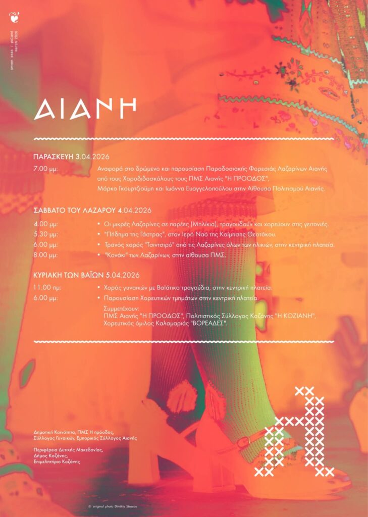 Ένα έθιμο που κρατάει από το 1600 και δεν έχει σταματήσει ποτέ από τότε σε κάποια χωριά παρά μόνο στα χρόνια του 2ου παγκοσμίου πολέμου είναι οι Λαζαρίνες της Αιανής. Σε κάποια άλλα χωριά γίνεται αναβίωση του εθίμου μιας και το επανέφεραν οι σύλλογοι μετά τη δεκαετία του 1980. Στην Αιανή Κοζάνης δεν σταμάτησε ποτέ και είναι βιωματικό με πολλές γυναίκες να παίρνουν μέρος.