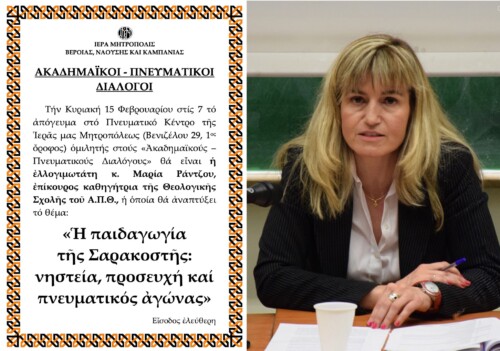 Τήν Κυριακή 15 Φεβρουαρίου στίς 7 τό ἀπόγευμα στό Πνευματικό Κέντρο τῆς Ἱερᾶς  Μητροπόλεως Βεροίας, Ναούσης καί Καμπανίας  (Βενιζέλου 29, 1ος ὄροφος) ὁμιλητής στούς «Ἀκαδημαϊκούς – Πνευματικούς Διαλόγους» θά εἶναι ἡ ἐλλογιμωτάτη κ. Μαρία Ράντζου, ἐπίκουρος καθηγήτρια τῆς Θεολογικῆς Σχολῆς τοῦ Α.Π.Θ., ἡ ὁποία θά ἀναπτύξει τό θέμα: «Ἡ παιδαγωγία τῆς Σαρακοστῆς: νηστεία, προσευχή καί πνευματικός ἀγώνας».