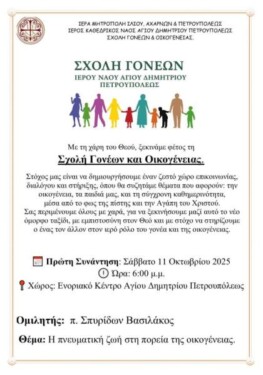 Ομιλία π. Σπυρίδωνος Βασιλάκου στη Σχολή Γονέων και Οικογένειας της ενορίας του Αγίου Δημητρίου Πετρουπόλεως