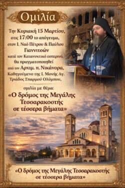 Την Κυριακή 15 Μαρτίου, στις 17:00 το απόγευμα, στον Ι. Ναό Αγίων Πέτρου & Παύλου Γιαννιτσών κατά τον Κατανυκτικό εσπερινό, θα πραγματοποιηθεί από τον Αρχιμ. π. Νικάνορα, Καθηγούμενο της Ι. Μονής Αγ. Τριάδος Σπαρμού Ολύμπου, ομιλία με θέμα: «Ο δρόμος της Μεγάλης Τεσσαρακοστής σε τέσσερα βήματα».