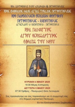 Στο Ιερό Παρεκκλήσιο Εισοδίων της Θεοτόκου, του Ιερού Ναού Αγίας Τριάδος Πετρουπόλεως, θα τελεστεί η πανήγυρις του Αγίου Οσιομάρτυρος Εφραίμ του νέου, σύμφωνα με το ακόλουθο πρόγραμμα: