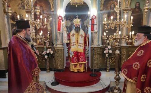 Ο Θεοφιλέστατος εκήρυξε τον Θείο λόγο αναφερόμενος στον βίο του Μεγαλομάρτυρος Αγίου Γεωργίου και τονίζοντας ότι ο Άγιος απεδείχθη εν τοις πράγμασι «Χριστού γεώργιον», που ως γη καλή και αγαθή εδέχθη τους λόγους της Πίστεως από τους ευλαβείς Χριστιανούς γονείς Του και απέδωσε καρπούς «εκατόν» με την τήρηση των Εντολών του Χριστού, πριν του μαρτυρίου Του. Απεδείχθη όμως και «Χριστού ευωδία» προσφέροντας την ζωής Του θυσία τω Θεώ δια του μαρτυρίου Του, οδηγώντας πολλούς ανθρώπους στην αληθινή Πίστη. Ο Θεοφιλέστατος μετέφερε τις Πασχάλιες ευχές του Σεβασμιωτάτου κ. Διονυσίου και προέτρεψε τους Πιστούς να επικαλούνται τις μεσιτείες του Τροπαιοφόρου Αγίου, ο Οποίος προστατευτικά σκεπάζει το Γένος μας, όπως αυτό απεδείχθη κατά τους χρόνους της δουλείας με το να εισακούει ακόμα και τα αιτήματα αλλοπίστων προστατεύοντας κατ̉ αυτόν τον τρόπο τους Ορθόδοξους Χριστιανούς.