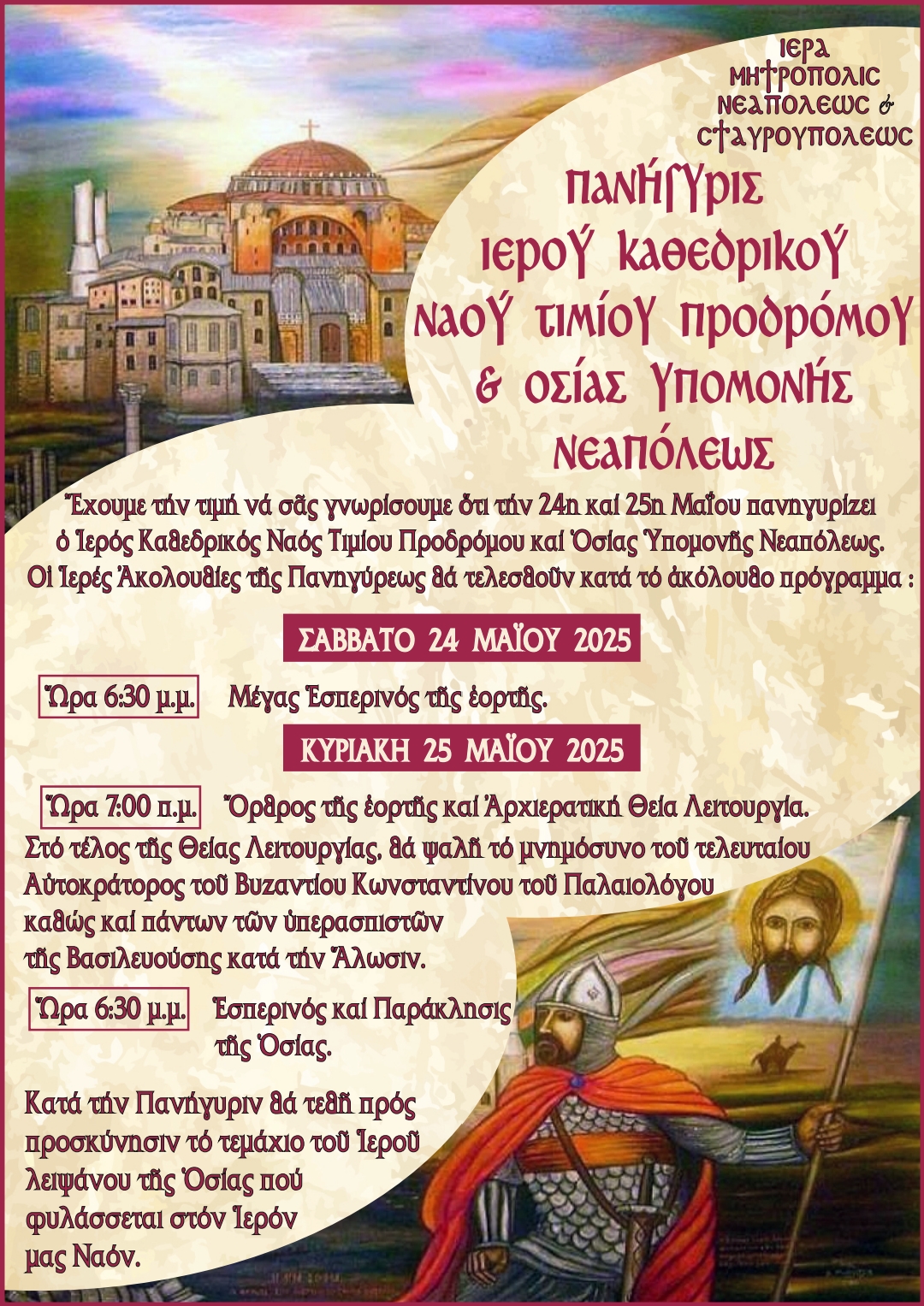Πανήγυρις Ιερού Καθεδρικού Ναού Τιμίου Προδρόμου και Οσίας Υπομονής Νεαπόλεως