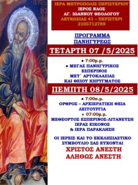 Πανηγυρίζει ο Ιερός Ναός του Αγ. Ιωάννου του Θεολόγου Περιστερίου