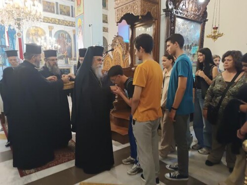 Τέλος, ο Σεβασμιώτατος μοίρασε προσωπικά σε κάθε υποψήφιο ένα στυλό – ως εργαλείο για τον αγώνα των εξετάσεων, μία εικόνα – για προστασία και ενίσχυση, κι ένα μικρό σταυρουδάκι – ως πνευματικό όπλο στη ζωή τους.
