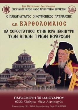 Σε απευθείας σύνδεση παρακολουθήσατε από τον πανηγυρίζοντα Ενοριακό Ιερό Ναό αγίων Τριών Ιεραρχών Θεσσαλονίκης , την  Πανηγυρική Θεία Λειτουργία, χοροστατούντος της Α.Θ.Π., του Οικουμενικού Πατριάρχου κ.κ. ΒΑΡΘΟΛΟΜΑΙΟΥ. Στο τέλος ο Οικουμενικός Πατριάρχης τέλεσε μνημόσυνο υπέρ των αειμνήστων καθηγητών, ευεργετών, δωρητών, φοιτητών και διατελεσάντων υπαλλήλων του Αριστοτέλειου Πανεπιστημίου.