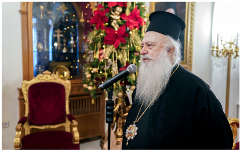 Ἀδελφοί μου, ὁ ὕμνος τῶν ἀγγέλων «δόξα ἐν ὑψίστοις Θεῷ καί ἐπί γῆς εἰρήνη» ἀκούεται καί σήμερα. Ἀκούεται σέ ἕναν κόσμο ταραγμένο ἀπό τίς συγκρούσεις καί τούς πολέμους, πού ἀναζητᾶ τήν εἰρήνη. Ἀκούεται γιά νά μᾶς ὑπενθυμίσει ποῦ καί πῶς μποροῦμε νά βροῦμε αὐτή τήν εἰρήνη πού ἐπιθυμοῦμε μέσα μας καί γύρω μας. Ἀκούεται γιά νά μᾶς βοηθήσει νά συνειδητοποιήσουμε ὅτι δέν ὑπάρχει εἰρήνη οὔτε στίς ψυχές μας οὔτε στόν κόσμο μας, ἐάν δέν πλησιάσουμε τόν Θεό, ἐάν δέν ταπεινωθοῦμε καί ἐμεῖς, ἐάν δέν ἀνοίξουμε τήν καρδιά μας μέ ἀγάπη πρός τούς ἀδελφούς μας, ἐάν δέν προσφέρουμε «τόπον ἐν τῷ καταλύματι» τῆς ψυχῆς μας στόν Θεό, πού γεννᾶται ἀπό ἀγάπη γιά τόν καθένα μας, καί στούς ἐλαχίστους ἀδελφούς του.
