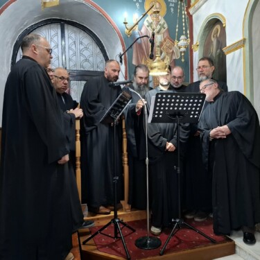 Τέλος τους ύμνους της πανηγύρεως απέδωσαν εκ δεξιού χορού ο Γενικός Αρχιερατικός Επίτροπος της Ιεράς Μητροπόλεως Κηφισίας Αμαρουσίου Ωρωπού και Μαραθώνος Πρωτοπρεσβύτερος Χρίστος Κυριακόπουλος με τον Πρωτοψάλτη του Ιερού Ναού Αγίας Μαρίνης Εκάλης κ. Βασίλειο Παπαγεωργίου και εξ αριστερού χορού ο Διευθυντής της Σχολής Βυζαντινής Μουσικής της Ιεράς Μητροπόλεως Καρυστίας και Σκύρου Πρωτοπρεσβύτερος Σωτήριος Τσούγκας εφημέριος Αετού – Καρύστου με τα μέλη του συλλόγου.