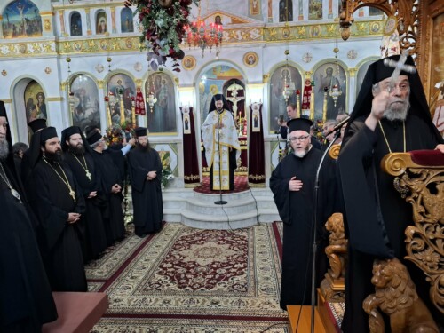 Πρό της απολύσεως, ο Πρύτανης της Ιεραρχίας της Εκκλησίας της Ελλάδος, Άγιος Καρυστίας κ.Σεραφείμ, εμπνεόμενος από την αποστολική εντολή “εν παντί ευχαριστείτε”, ευχαρίστησε τους Αγίους Αρχιερείς για την παρουσία τους στη Θεία Λειτουργία, και όλους όσοι συνέβαλαν στην επιτυχή διοργάνωση της Πανηγύρεως