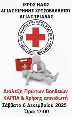 Το επόμενο Σάββατο, 06 Δεκεμβρίου 2025, στις 17:00, στον χώρο του Ιερού Ναού Αγίας Ειρήνης Χρυσοβαλάντου Αγίας Τριάδας θα βρίσκεται η ομάδα του Ελληνικού Ερυθρού Σταυρού όπου θα πραγματοποιήσει διάλεξη Πρώτων Βοηθειών – ΚΑΡΠΑ & Χρήσης απινιδωτή. Είναι σημαντικό να γνωρίζουμε Πρώτες βοήθειες, όπως και τη χρήση ενός απινιδωτή διότι μπορούμε να σώσουμε ζωές!