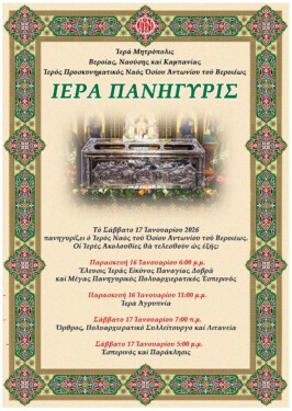 Φέρεται εἰς γνῶσιν τῶν εὐσεβῶν Χριστιανῶν ὅτι τό Σάββατο 17 Ἰανουαρίου 2026, τιμᾶται πανηγυρικῶς ἡ ἱερά μνήμη τοῦ Προστάτου καί Πολιούχου τῆς πόλεως τῆς Βεροίας, Ὁσίου Ἀντωνίου τοῦ Νέου, εἰς τόν ἐπ᾽ ὀνόματί του Ἱερόν Προσκυνηματικόν Ναόν, ὅπου καί πρόκειται νά πραγματοποιηθοῦν λατρευτικαί ἐκδηλώσεις συμφώνως πρός τό πρόγραμμα τῆς ἑορτῆς.