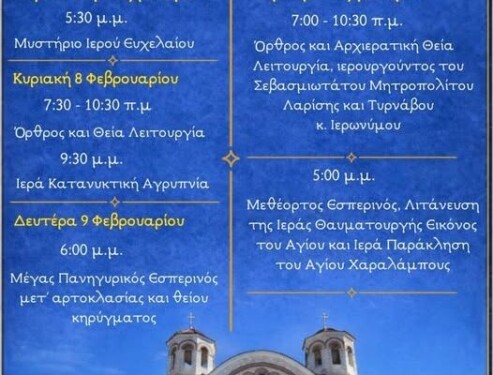 Πρόγραμμα Πανηγύρεως Ιερού Ναού Αγίου Χαραλάμπους Λαρίσης